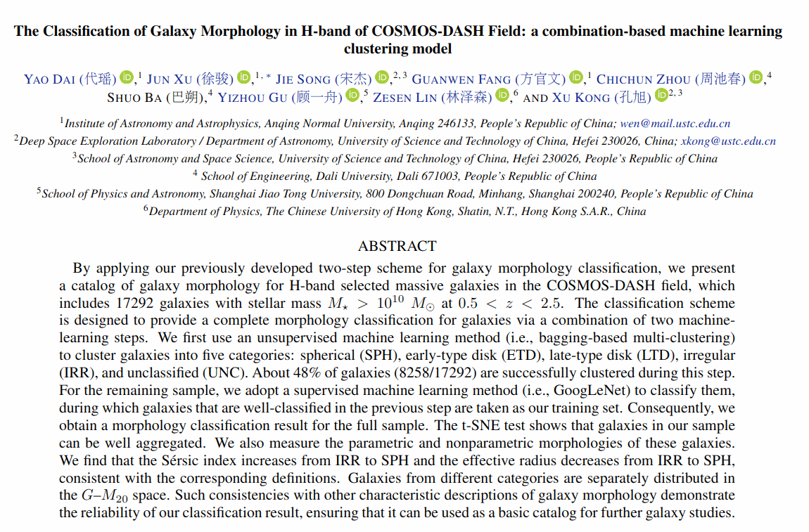 近日,beat365官网数理学院统计学研究生代瑶同学的研究成果《The Classification of Galaxy Morphology in H-band of COSMOS-DASH Field: a combination-based machine learning clustering model》被国际著名期刊《The Astrophysical Journal Supplement Series》(中科院一区top期刊,IF=8.70)接受发表。本论文是在数理学院天文与天体物理研究所方官文研究员及其研究团队的指导下完成,代瑶同学为第一作者,beat365英国官网网站为第一完成单位。