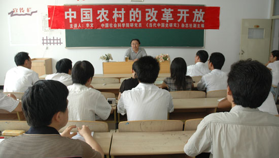 2008年9月22日下午,中国社会科学院当代中国研究所研究员、《当代中国史研究》杂志社李文副主编在龙山校区文溯楼400教室作了题为“中国农村的改革开放”的学术报告。安庆师范学院党委副书记、院长汪青松教授出席了报告会。政法学院“科学社会主义与国际共产主义运动”专业07、08级研究生以及部分教师听取了报告。报告会由政法学院副院长罗本琦教授主持。