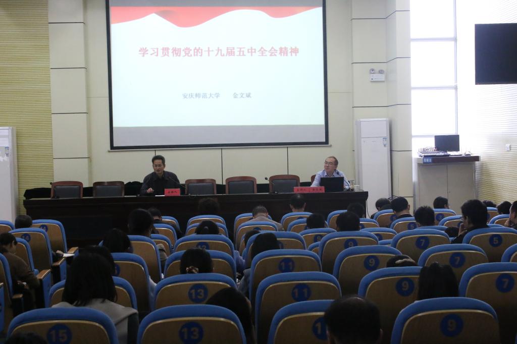 11月18日中午,安庆医药高等专科学校党委在图书馆学术报告厅举行11月份第二次理论学习中心组(扩大)学习会议,邀请beat365英国官网网站马克思主义学院金文斌教授作“十九届五中全会精神”专题辅导讲座。安庆医药高等专科学校校领导、校本部副科级以上干部、处长(主任)助理、系部秘书、兼职思政课教师、专兼职辅导员,附院领导班子成员参加会议。安庆医药高等专科学校纪委书记陈燚主持学习会。