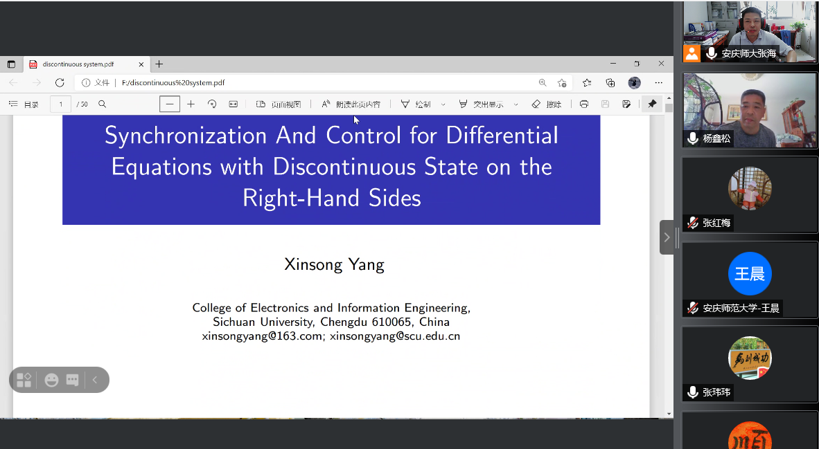 6月17日下午,四川大学博士生导师杨鑫松教授应数理学院邀请作了一场题为“Synchronization and Control for Differential Equations with Discontinuous State on the Right-hand Sides”的线上学术报告。数理学院副院长张海教授、数学一级学科硕士点导师和研究生同学参加了本次报告会,报告会由张海教授主持。