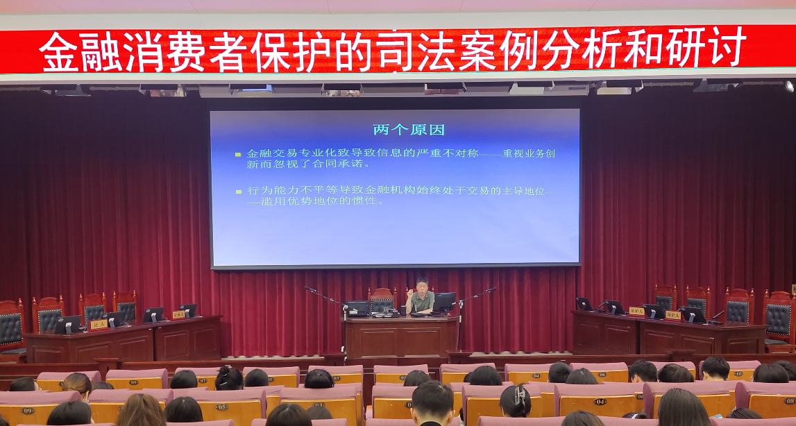 为提高在校生对自身金融消费保护权益的重视,5月11日,法学院在法学楼模拟法庭开展金融消费权益保护的司法案例分析和研讨,王鑫博士带领80名同学参加了此次分析研讨。