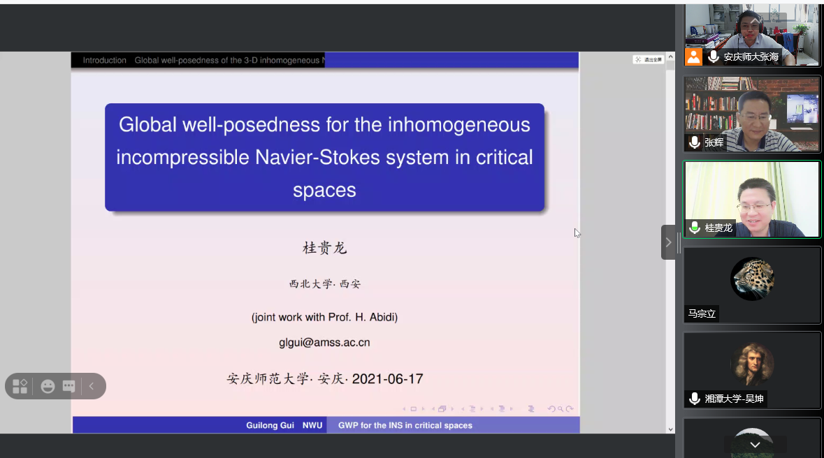 6月17日上午,西北大学数学学院桂贵龙教授应数理学院邀请作了一场题为“Global well-posedness for the inhomogeneous incompressible Navier-Stokes system in critical space”的线上学术报告。数理学院副院长张海教授、数学一级学科硕士点部分导师和研究生同学参加了本次报告会,报告会由张海教授主持。