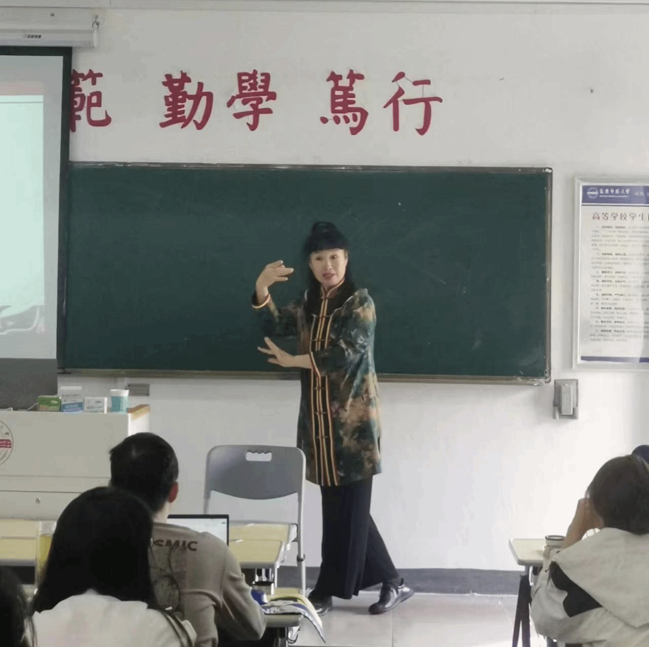 讲座期间,孙萍带领大家诵读富连成社科班训词,表演《霸王别姬》剧目,分析安庆在京剧发展史上的地位,体会富连成科班风格,激发听众兴趣,发掘学术问题。整堂演讲,艺术性与学术性融为一体,讲座现场气氛热烈,掌声不断。