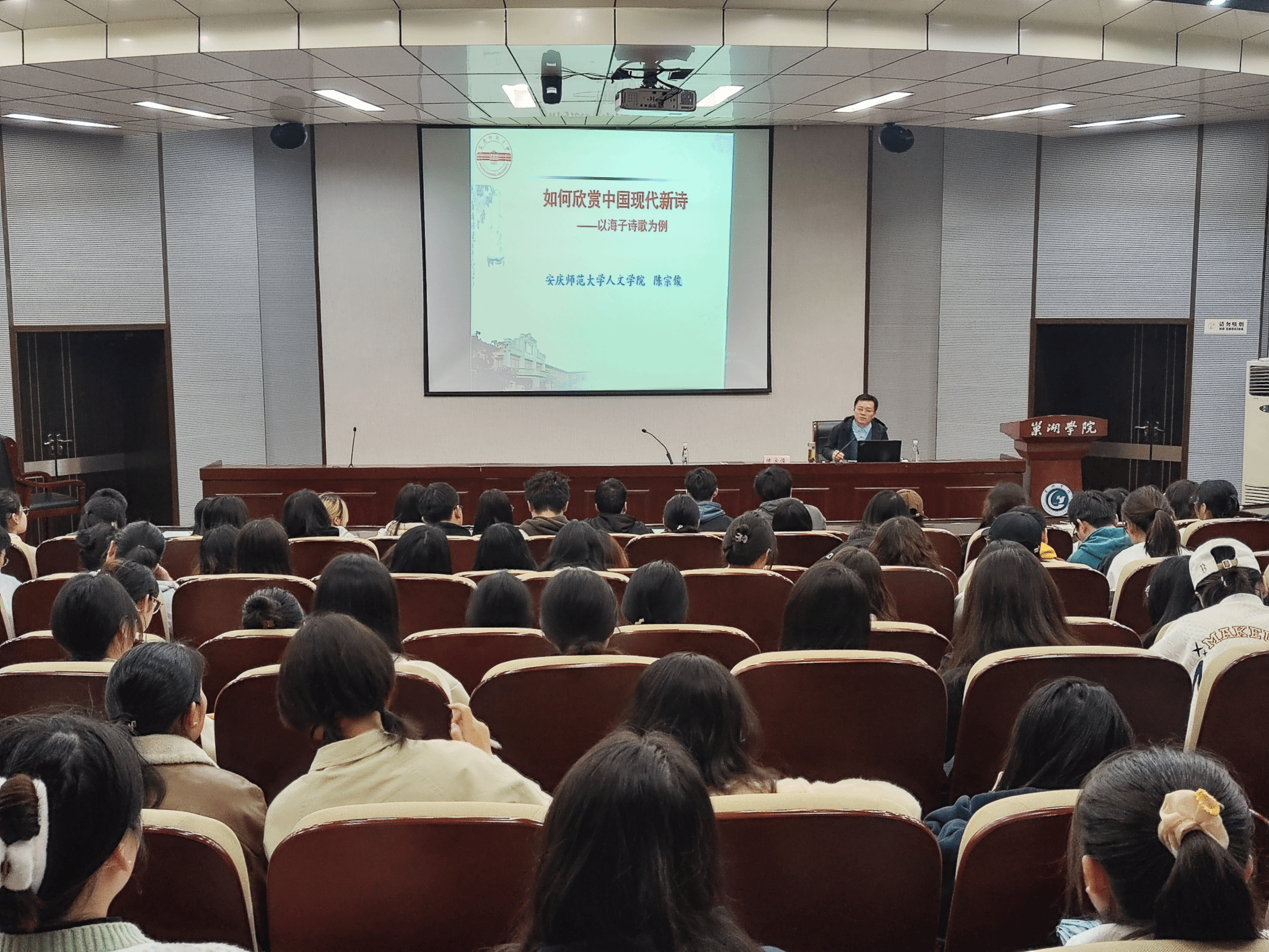 3月23日,应巢湖学院文学与传媒学院和科研处的共同邀请,人文学院陈宗俊教授赴该校作题为“如何欣赏中国现代新诗——以海子诗歌为例”的学术讲座。巢湖学院汉语言文学专业全体学生和部分教师近百人聆听了讲座。讲座由该院中文系主任吴强副教授主持。
