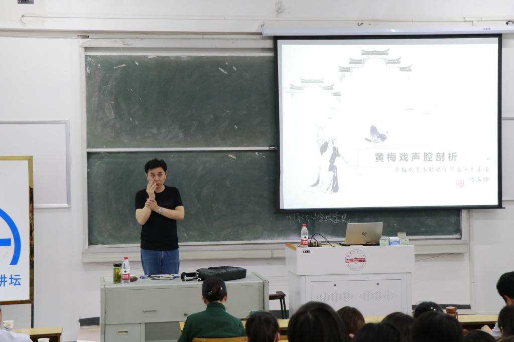 潘文格老师首先从黄梅戏声腔与唱腔的关系辨析入手,强调声腔和方言是戏曲剧种艺术特色的集中体现,安庆官话音调柔和,节奏鲜明,这是黄梅戏的特色,是黄梅戏唱腔具有独特韵味之处。在讲座中,潘文格老师列举了很多黄梅戏唱腔实例,现场亲自示范演唱,声情并茂地剖析黄梅戏唱腔的分类、特点、腔体结构和演唱要领。潘文格老师妙趣横生的示范表演深受同学们和在场戏迷的喜爱,讲座内容既有系统的理论总结,也有潘文格老师多年黄梅戏表演与教学的实践总结,非常耐人寻味。