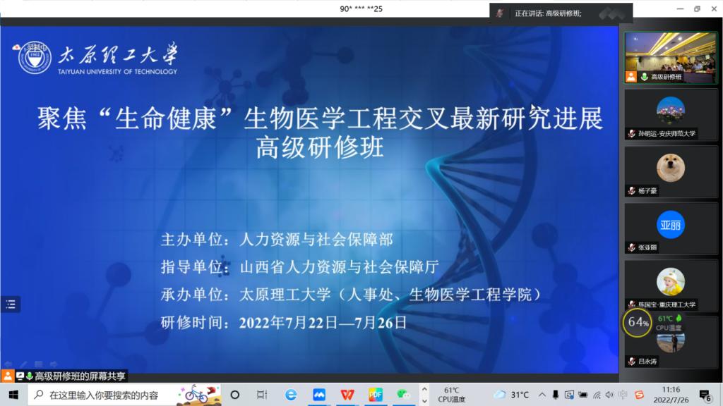 7月22-26日,由国家人力资源与社会保障部主办、山西省人力资源与社会保障厅指导、太原理工大学承办的聚焦“生命健康”生物医学工程交叉最新研究进展高级研修班在太原开班。来自全国各地高校73名学者参加此次研修会议。孙明运教授代表beat365官网参加会议。