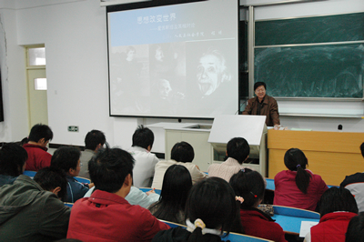 程曦老师用幽默诙谐、生动形象的语言和事例,把晦涩难懂的科学名著《相对论》阐释得通俗易懂,不时博得学生的阵阵掌声。(大学生文化素质教育基地办公室)