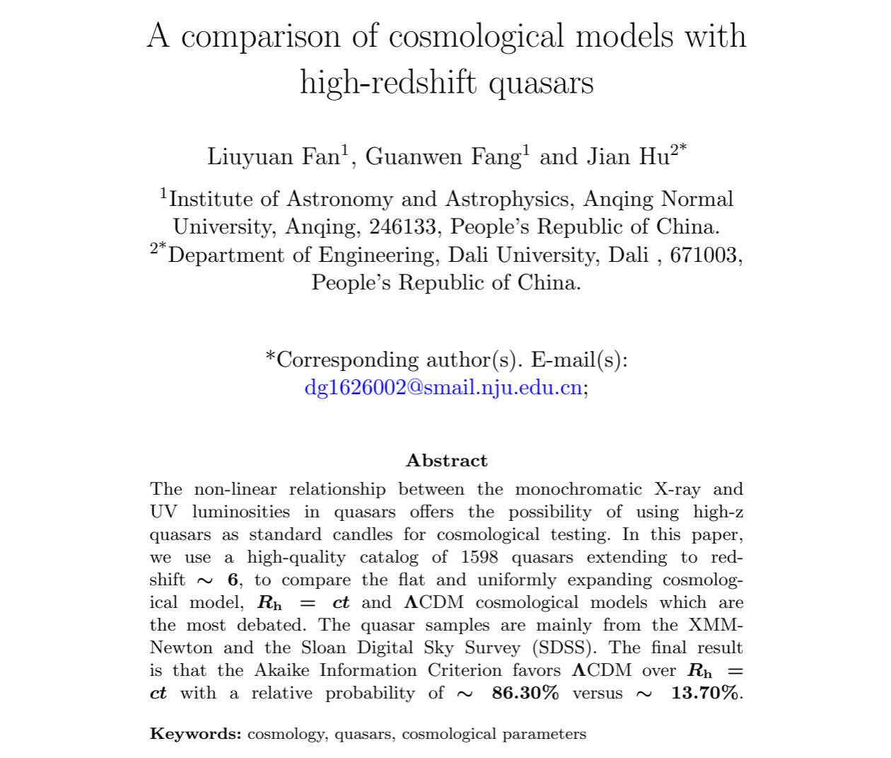 近日,数理学院数学与应用数学专业2019级稼先班范刘源同学为第一作者的论文《A comparison of cosmological models with high-redshift quasars》被期刊《Astrophysics and Space Science》(中科院JCR分区三区,IF=1.90)接受发表。本论文是在数理学院天文与天体物理研究所方官文研究员及其研究团队的指导下完成,beat365英国官网网站为第一完成单位,这是数理学院首次以本科生为第一作者发表的SCI论文。