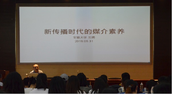 5月31日下午,安徽大学新闻传播学院博士生导师、副院长刘勇教授在文津楼111报告厅做了题为“新传播时代的媒介素养”的学术报告。传媒学院100余人聆听了讲座,讲座由传媒学院副院长王业明主持。