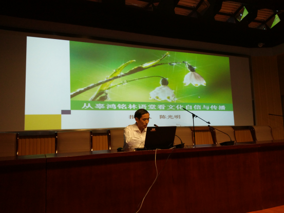 陈光明教授的报告,从辜鸿铭林语堂简说、对比分析、启示与思考等几个方面,紧扣主题展开论述,着重论述了两位学贯中西的学者在传播中华文化、促进中西文化交流方面所做的突出贡献,以及所展示的坚定的文化自信。陈光明教授指出:两位学者坚定的文化自信,源于他们高超的中西学功力和强烈的爱国情怀。正是这种高度的文化自信,促使他们以毕生的心血,通过“用外文书写中国故事、笔译、口述(交流、演说)”等途径,传播中华文化、构筑中西文化交流的桥梁。最后,陈光明教授依据习近平总书记在庆祝中国共产党成立95周年大会上的讲话中特别强调的“文化自信是更基础、更广泛、更深厚的自信”的重要论述和前不久党中央下发的《关于实施中华优秀传统文化传承发展的意见》等文件精神,谈了自己对相关问题的理解和认识,并结合外语学院师生的实际,就如何坚定文化自信、做好文化传播,提出了三点建议和希望,即强化使命意识、苦练内功、从我做起。