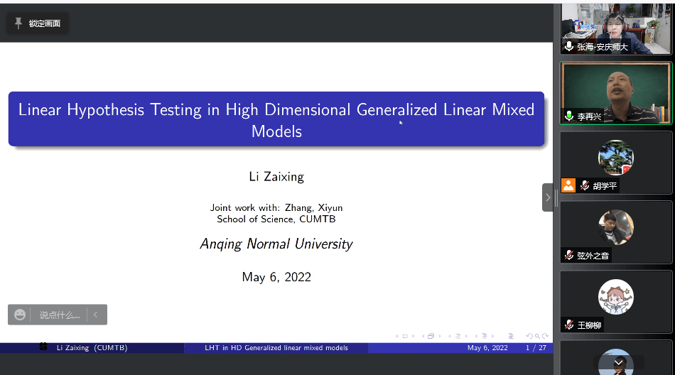 5月6日晚上,2000届校友、中国矿业大学(北京)理学院院长、博士生导师李再兴教授应数理学院邀请作了一场题为“Linear Hypothesis Testing in Ultra High Dimensional Generalized Linear Mixed Models”的线上学术报告。数理学院副院长张海教授、统计学硕士点点长胡学平教授、部分教师和硕士研究生参加了本次报告会,报告会由张海主持。