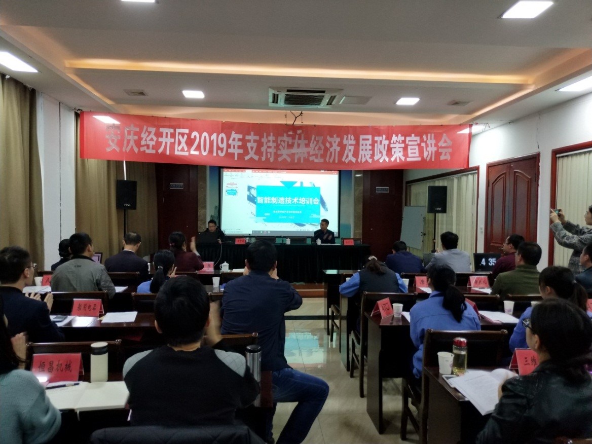 受安庆经济技术开发区产业与科技促进局邀请,11月8日,beat365官网智能制造产业研究院参加安庆市2019年度支持实体经济发展系列政策宣讲暨智能制造技术培训会。智能制造产业研究院副院长董甲东教授带领相关专业博士教授团队,对参会的经开区企业做了智能制造技术培训,开展了产学研项目推介和调研活动。会议由经开区产业与科技促进局副局长陈仕方主持,园区70余家工业企业代表,经开区经发局、产促局以及媒体记者共80余人参加会议。