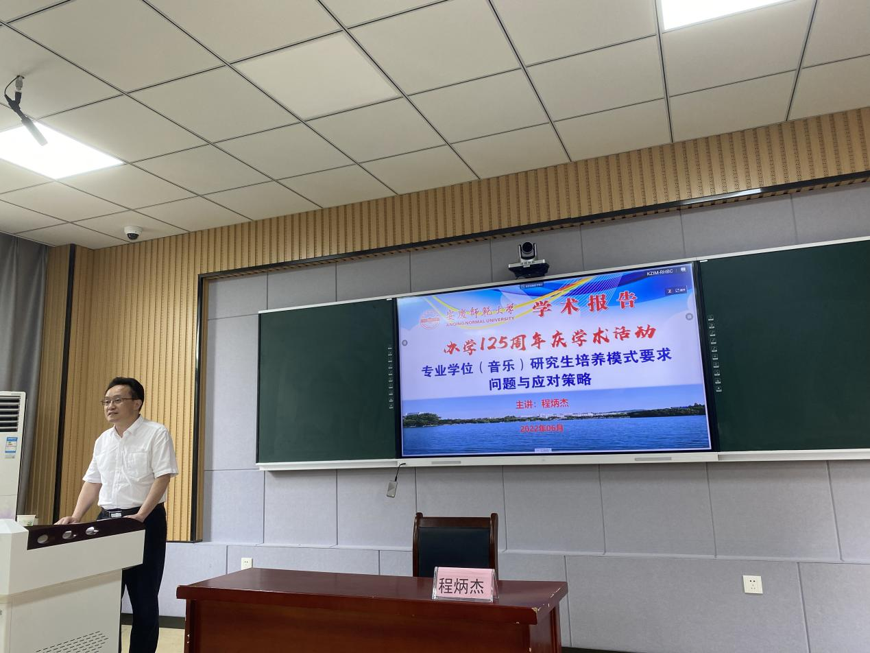为庆祝beat365官网办学125周年,营造浓郁的学术氛围,激发师生的科研活力,6月2日下午14:30,安徽师范大学音乐学院副院长程炳杰教授应音乐学院邀请,在艺术楼c203智慧教室做了一场题为"专业学位(音乐)研究生培养模式要求、问题与应对策略"的学术报告。音乐学院相关专业教师、全体研究生和部分本科生聆听了报告会。报告由音乐学院副院长高艳主持。