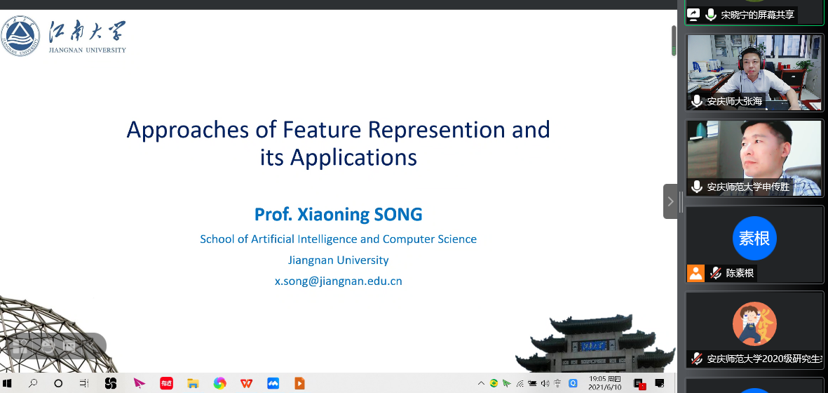 报告会上,宋晓宁教授就当前模式识别和计算机视觉研究领域内主流的表示学习、深度学习、量化学习以及领域知识共享等问题进行了阐述,介绍了多种模型的建模理论,刻画了非限制场景下的生物特征识别的准确性和实时性。宋晓宁教授还与部分教师和研究生同学就模式识别和计算机视觉最新研究方法和热点问题进行了线上互动交流。