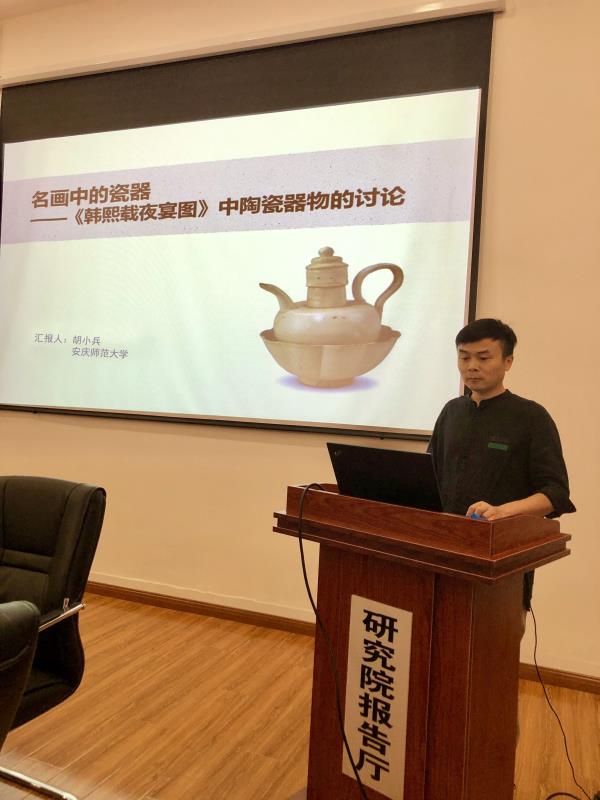 全国艺术学青年学者论坛,两年一届,旨在为专家学者的艺术学成果提供交流平台,此次论坛主题为“探赜索隐:艺术史研究中的‘他域’探寻。胡小兵教授从《韩熙载夜宴图》的图像出发,运用类型学方法,将《韩》卷中的陶瓷器物与青白瓷和越窑青瓷窑口的出土器物进行比较,对《韩》卷中陶瓷器物的窑口归属问题,和与会学者进行深入交流,得到学者们的积极回应。