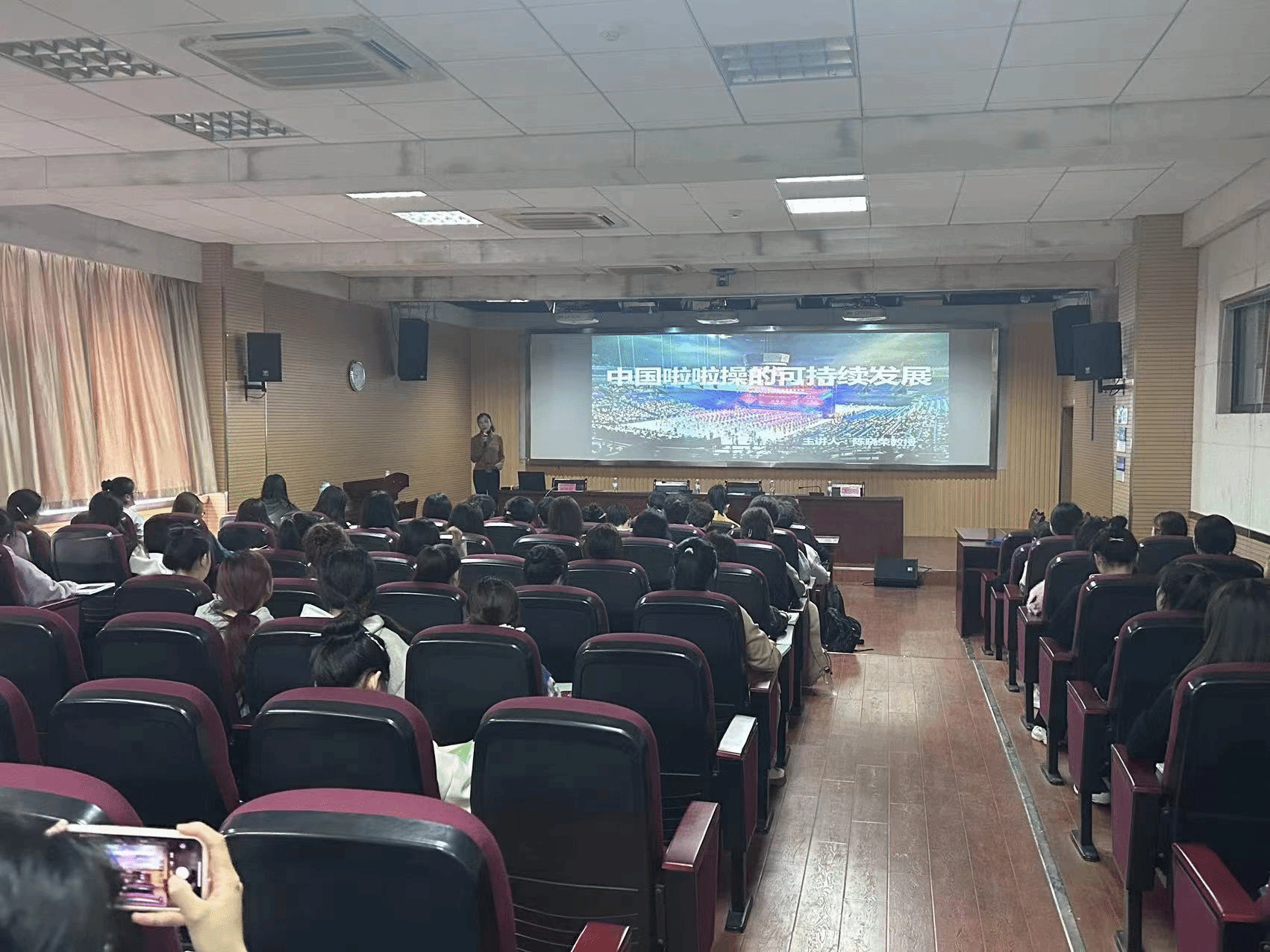3月23日,安徽医科大学教授、中国蹦床与技巧协会啦啦操分会安徽省啦啦操分会主任、安徽省学校体育协会副秘书长、舞蹈啦啦操国际级裁判、全国七彩星级考试监督陈晓荣老师应邀做客“行健讲堂”,作题为“中国啦啦操的可持续性发展”的专题讲座。讲座由体育学院副院长王晓东教授主持,院长周多奇、副书记王玮、表演专业老师和学生近100人到场聆听了讲座。