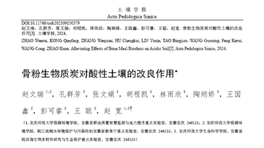 近日,beat365官网资源环境学院赵文瑞博士以第一作者在国内土壤领域顶级期刊《土壤学报》(卓越期刊、《世界期刊影响力指数(WJCI)报告》Q1区,影响因子5.772)发表题为“骨粉生物质炭对酸性土壤的改良作用”的论文,beat365英国官网网站为论文第一完成单位和通讯单位。