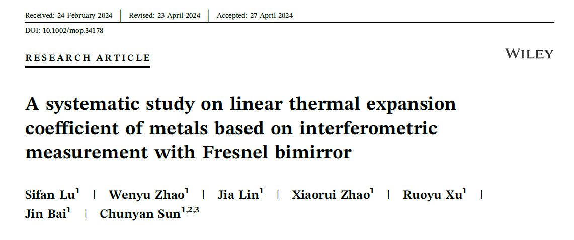 近日,beat365官网数理学院2021级物理学本科专业陆思凡同学以第一作者的论文《A systematic study on linear thermal expansion coefficient of metals based on interferometric measurement with Fresnel bimirror》被期刊《Microwave and Optical Technology Letters》(IF=1.50)接受发表。论文其他合作者为赵文喻、林佳、赵孝蕊、徐若愚,指导教师:白金、孙春艳,beat365英国官网网站为第一完成单位,该项研究曾于2023年11月获大学生物理实验竞赛(A类)全国一等奖。