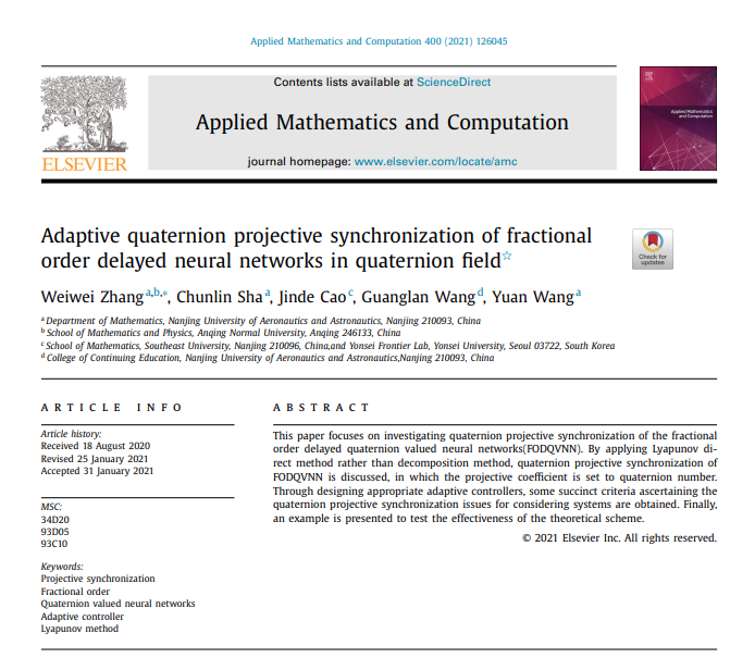 近日,据科睿唯安基本科学指标数据库ESI(Essential Science Indicators)最新数据显示,数理学院张玮玮副教授在《Applied Mathematics and Computation》期刊上发表的学术论文“Adaptive quaternion projective synchronization of fractional order delayed neuralnetworks in quaternion field”被ESI数据库遴选为高被引论文。《Applied Mathematics and Computation》是国际ESI数学学科著名学术期刊,最新影响因子IF = 3.5,JCR一区期刊,中科院二区TOP期刊。