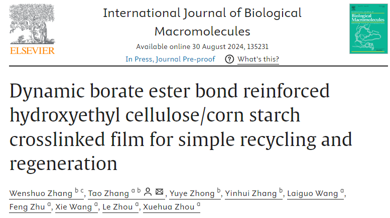 近日,化学化工学院张涛博士在国际权威期刊《International Journal of Biological Macromolecules》(中科院一区TOP期刊,影响因子7.7)发表题为“Dynamic borate ester bond reinforced hydroxyethyl cellulose/corn starch crosslinked film for simple recycling and regeneration”的论文,beat365英国官网网站为论文的第一单位和唯一通讯单位。