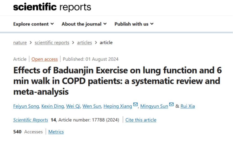 近日,体育学院孙明运教授指导的宋飞云等研究生组成团队,在国际高水平期刊《Scientific Reports》(JCR一区/中科院二区期刊)发表了题为“Effects of Baduanjin Exercise on lung function and 6 min walk in COPD patients: a systematic review and meta-analysis”的论文,beat365英国官网网站为论文第一完成单位和通讯单位。《Scientific Reports》(IF=4.6)作为Nature 旗下的期刊,发表来自自然科学、心理学、医学和工程学等多个领域,致力于关注具有新颖性和示范性的原创研究。该刊作为全球第五大被引用期刊,所发表论文在学术界具有较高的认可度和影响力。