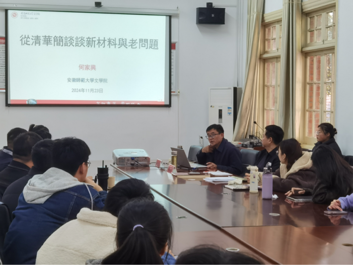 11月23日,安徽师范大学文学院教授、博士生导师何家兴应邀做客敬敷人文讲坛作了题为“从清华简谈谈新材料与老问题”的学术讲座。本次讲座由陈世庆教授主持,部分青年教师、研究生和本科生参加了此次活动。