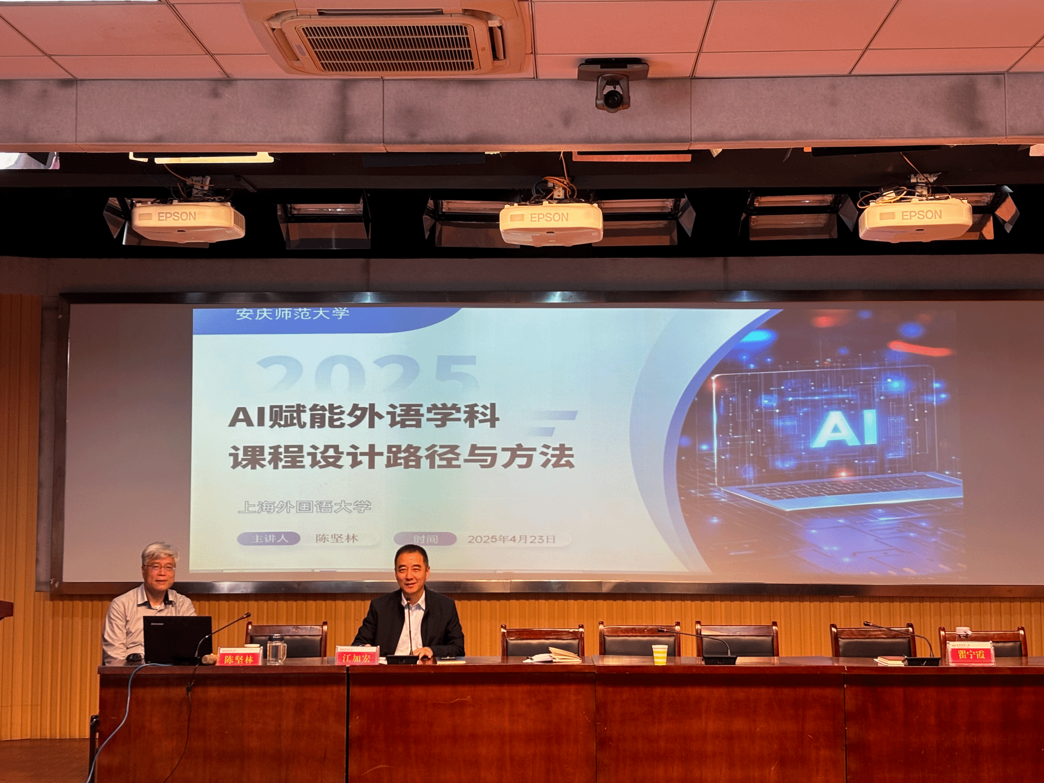 为深化课程教学改革,推进“AI+外语”课程培育工作,4月23日,上海外国语大学博士生导师陈坚林教授应邀到外国语学院作题为《AI赋能外语学科课程设计路径与方法》的学术报告。学院全体教师与24级研究生参加了报告会。报告由外国语学院院长江加宏主持。