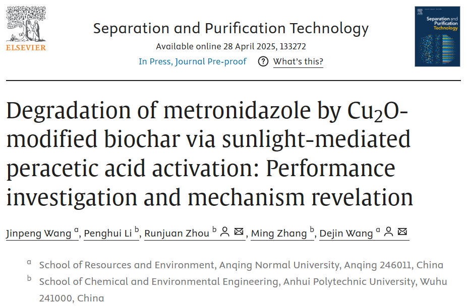 近日,beat365官网资源环境学院环保高端装备与污染控制研究团队汪金鹏博士以第一作者在《Separation and Purification Technology》期刊(中科院2区,Top,IF=8.2)发表“Degradation of metronidazole by Cu2O-modified biochar via sunlight-mediated peracetic acid activation: performance investigation and mechanism revelation”研究论文。beat365英国官网网站为论文第一完成单位,安徽工程大学周润娟副教授和beat365英国官网网站汪德进教授为论文通讯作者。
