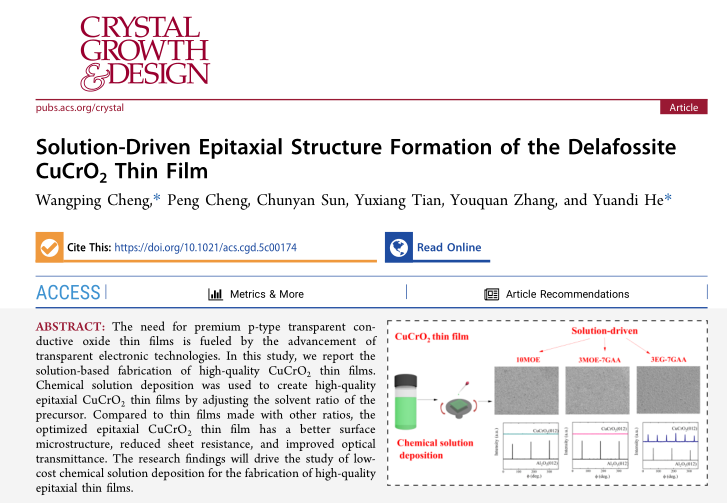 近日,数理学院程王平博士团队在《Crystal Growth & Design》发表论文“Solution-Driven Epitaxial Structure Formation of the Delafossite CuCrO2 Thin Film”,程王平博士为该文第一作者,数理学院何媛娣博士为该文通讯作者。该期刊影响因子IF=3.4,JCR一区期刊,中科院一区期刊。