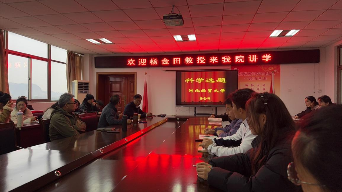 12月12日,河北经贸大学杨金田教授应邀做客体育学院“行健讲堂·大家谈”,以“体育学科科学选题”为主题召开专题报告会。体育学院副院长孙明运主持报告会,副院长王晓东、师生代表共同聆听这场学术讲座。