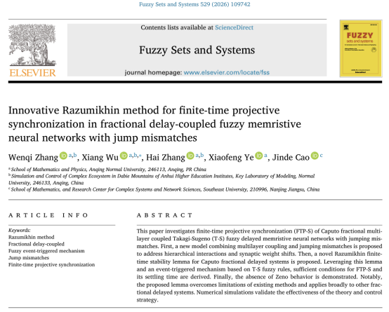 近日,数理学院2024级研究生张文琦以第一作者和导师团队在国际学术期刊《Fuzzy Sets and Systems》发表论文“Innovative Razumikhin method for finite-time projective synchronization in fractional delay-coupled fuzzy memristive neural networks with jump mismatches”,导师吴祥博士为该论文通讯作者,该期刊影响因子3.2,中科院一区Top期刊。