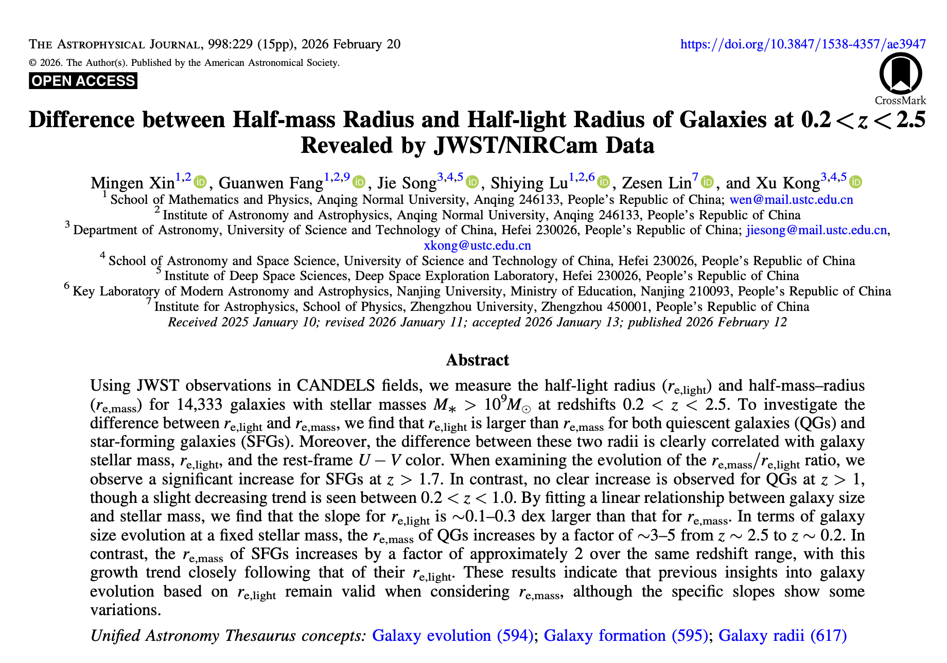 近日,物理学专业2023级邓稼先班本科生辛明恩同学以第一作者撰写的论文《Difference between half-mass radius and half-light radius of galaxies at 0.2<z<2.5 revealed by JWST/NIRCam data 》被SCI期刊《Astrophysical Jounral》正式发表。该期刊为天文学领域国际三大顶级期刊之一,其影响因子为IF=5.4,JCR一区,中科院二区。本论文是在物理与天文空间学院天文与天体物理研究所方官文研究员及陆诗莹博士的指导下完成,beat365英国官网网站为第一完成单位,方官文研究员为通讯作者。