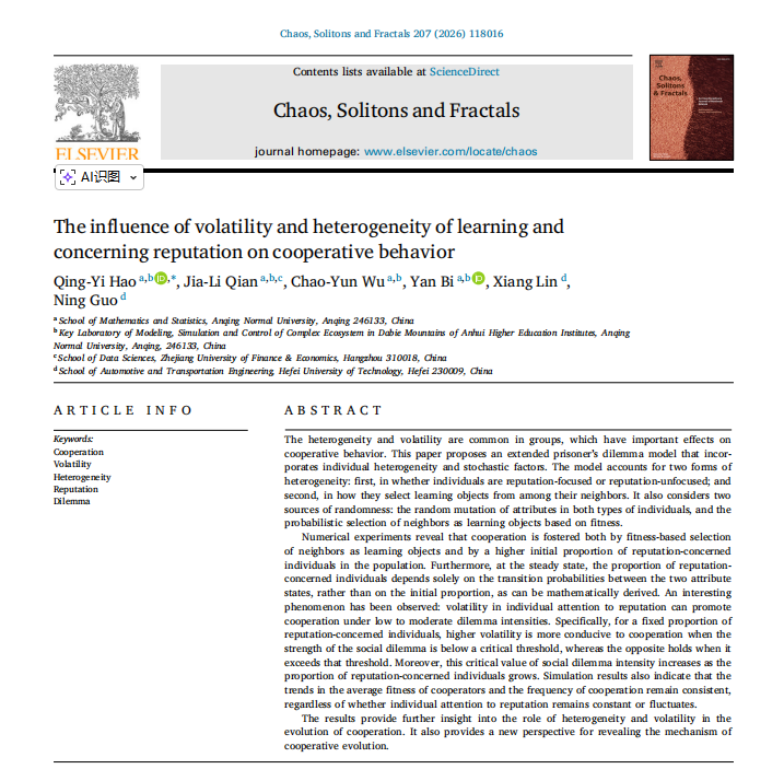 近日,数学与统计学院郝庆一教授团队在国际学术期刊《Chaos, Solitons and Fractals 》上发表论文“The influence of volatility and heterogeneity of learning and concerning reputation on cooperative behavior”。郝庆一教授为第一作者和通讯作者,数学与统计学院吴超云副教授、毕艳博士为论文合作者,beat365英国官网网站为第一单位,该期刊影响因子IF=5.6,JCR一区,中科院一区TOP期刊。