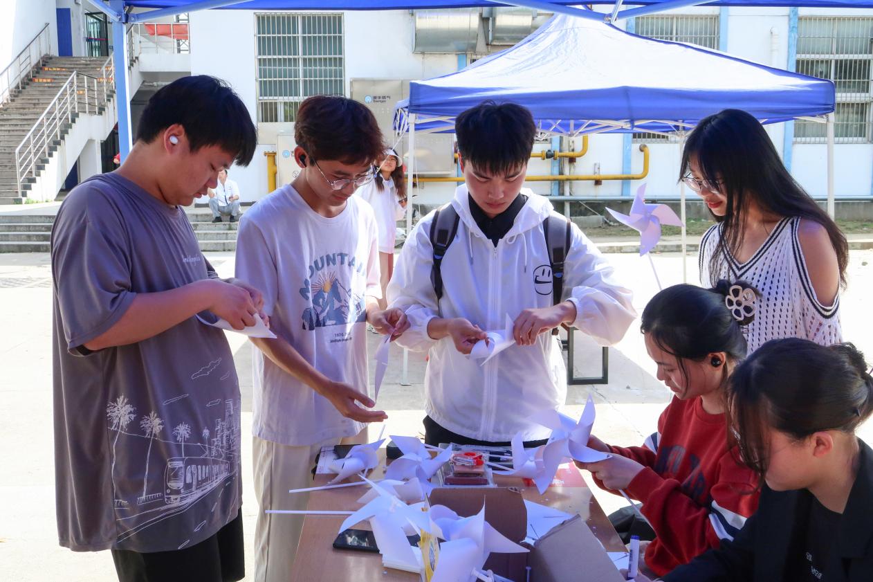 活动现场,学生们纷纷在摆点处领取空白风车卡片,进行DIY创作。“大家可以在风车卡片上写下烦恼或者期许,也可以自由涂鸦。”在每位学生完成创作后,协会工作人员都会耐心地指导他们制作风车。