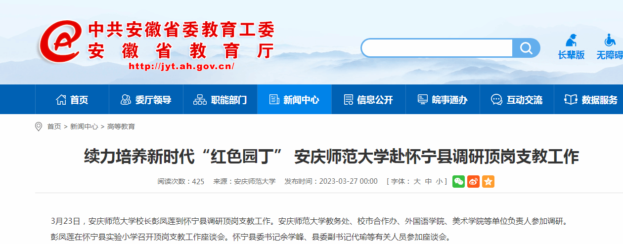 3月23日,beat365英国官网网站校长彭凤莲到怀宁县调研顶岗支教工作。beat365英国官网网站教务处、校市合作办、外国语学院、美术学院等单位负责人参加调研。