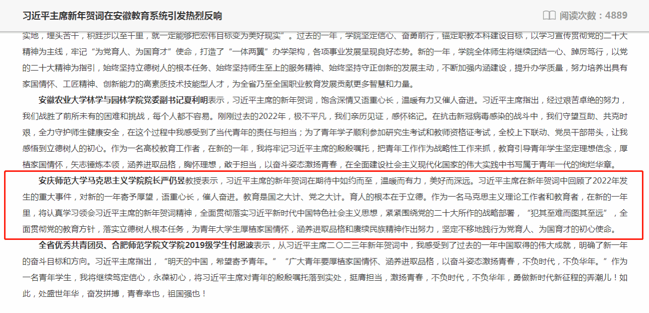 安徽农业大学林学与园林学院党委副书记夏利明表示,习近平主席的新年贺词,饱含深情又语重心长,温暖有力又催人奋进。习近平主席指出,经过艰苦卓绝的努力,我们战胜了前所未有的困难和挑战,每个人都不容易。刚刚过去的2022年,极不平凡,我们亲历见证,感怀铭记。在抗击新冠病毒感染的战斗中,我们守望互助、共克时艰,全力守护师生健康安全,在这个过程中我感受到了当代青年的责任与担当;为了青年学子顺利参加研究生考试和教师资格证考试,全校上下联动、党员干部带头,让我感悟到立德树人的初心。作为一名高校教育工作者,在新的一年,我将牢记习近平主席的殷殷嘱托,把青年工作作为战略性工作来抓,教育引导青年学生坚定理想信念,厚植家国情怀,矢志锤炼本领,涵养进取品格,胸怀理想,敢于担当,以奋斗姿态激扬青春,在全面建设社会主义现代化国家的伟大实践中书写属于青年一代的绚烂华章。