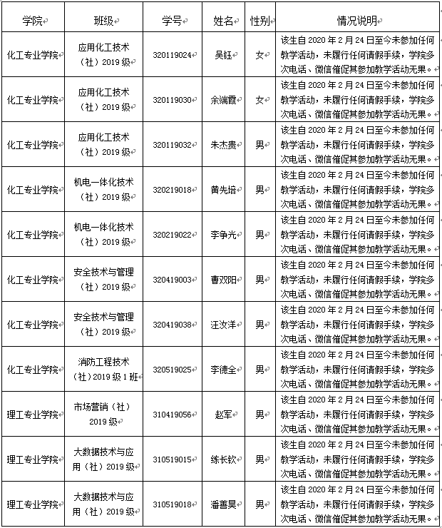 吴钰、余端霞、朱杰贵、黄先培、李争光、曹双阳、汪汝洋、李德全、赵军、练长钦、潘善昊同学无视校规校纪,未经学校批准,连续两周以上未参加学校规定的教学活动,具体情况如下: