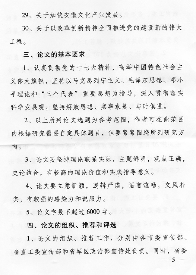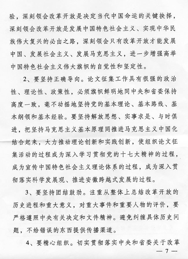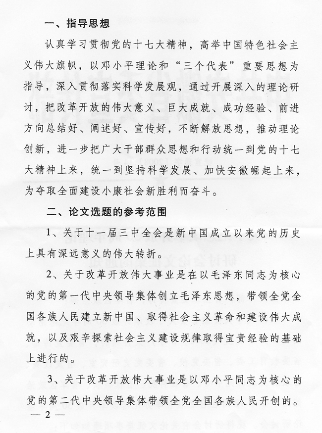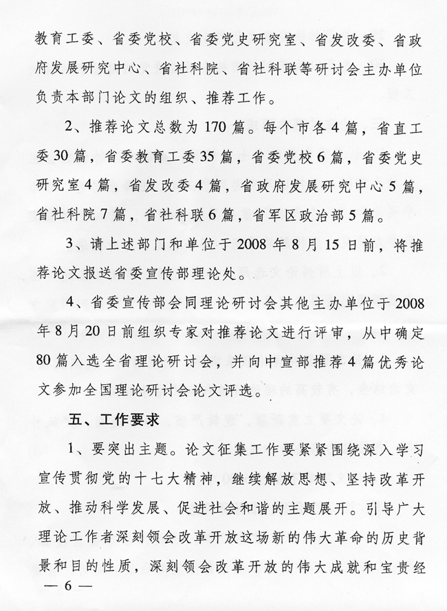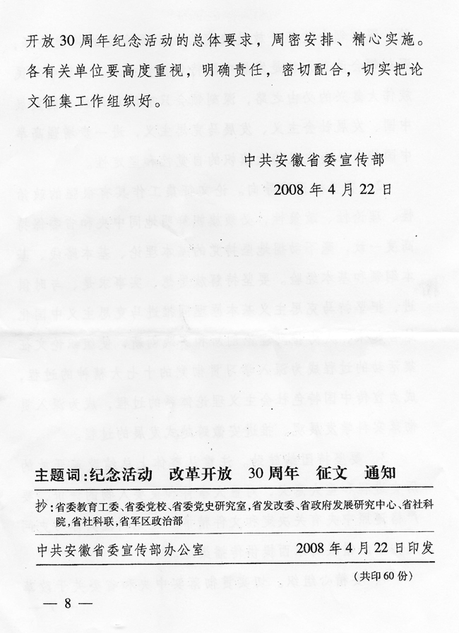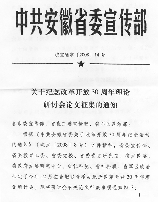 根据《中共安徽省委关于改革开放30周年纪念活动的通知》(皖发【2008】8号)精神,省委宣传部日前发出《关于纪念改革开放30周年理论研讨会论文征集的通知》(皖宣通字【2008】14号)。现将该通知转发给你们。请根据通知精神,认真组织开展论文征集工作。请各校务必于2008年8月5日前,将论文(本科院校2篇、专科学校1篇)报送省委教育工委社政处。我们将组织专家从中遴选35篇报省委宣传部参评。