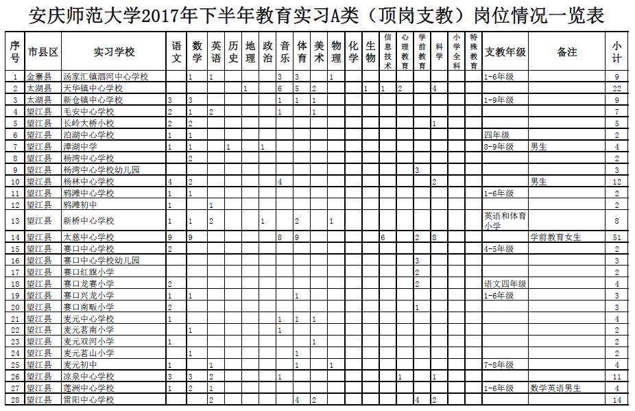 附:beat365英国官网网站2017年下半年教育实习A类(顶岗支教)岗位情况一览表