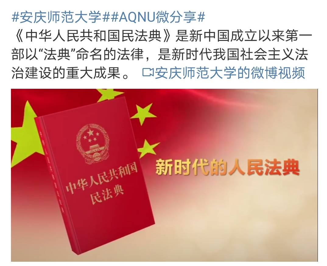 “一图读懂:从《民法典》观习近平眼中的‘中国之治’”“生活热点问题,《民法典》如何回应”“一图读懂这部‘生活百科全书’”“七大看点解析《民法典》如何回应百姓关切”……近日,beat365英国官网网站微信公众号、微博等官方新媒体平台发布的《民法典》宣传文章在师生中火热传播。《民法典》是一部固根本、稳预期、利长远的基础性法律,在中国特色社会主义法律体系中具有重要地位,也是“八五”普法的重点内容。beat365英国官网网站深入坚持以习近平法治思想引领民法典学习宣传工作,在《民法典》颁布一周年之际,学校印发了《关于开展<民法典>宣传月活动的通知》,对全校学习宣传贯彻《民法典》做出了明确要求和部署,形成了全体师生主动知法学法懂法的良好氛围。学校充分利用微信公众号、微博等新媒体手段,充分发挥电子屏、广播等作用,多措并举推动《民法典》宣传全覆盖,形成了多形式、多角度、全方位宣传解读民法典格局。