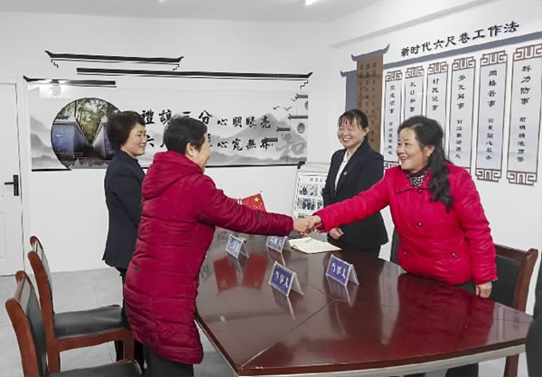 桐城市西苑社区书记乔丽娟(右二)正在用新时代六尺巷工作法主持调解。江道宏 摄