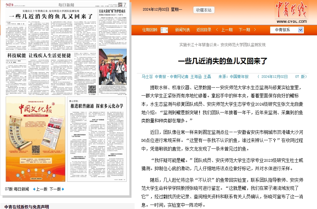 今年9月29日,团队于安徽省铜陵市枞阳县长河大桥附近发现野生日本鳗鲡群体,2023年9月和今年4月,团队在菜子湖主湖区首次记录到国家二级保护野生动物背瘤丽蚌和中国淡水蛏……