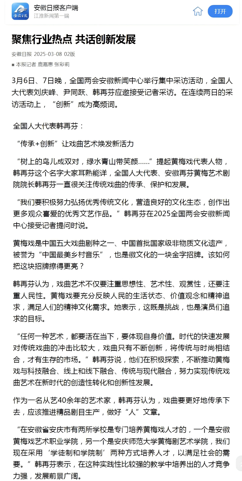 下一篇:安徽日报:代表委员风采 | 创作更多符合时代和人民需要的优秀文艺作品——访全国人大代表、安徽再芬黄梅艺术剧院院长韩再芬