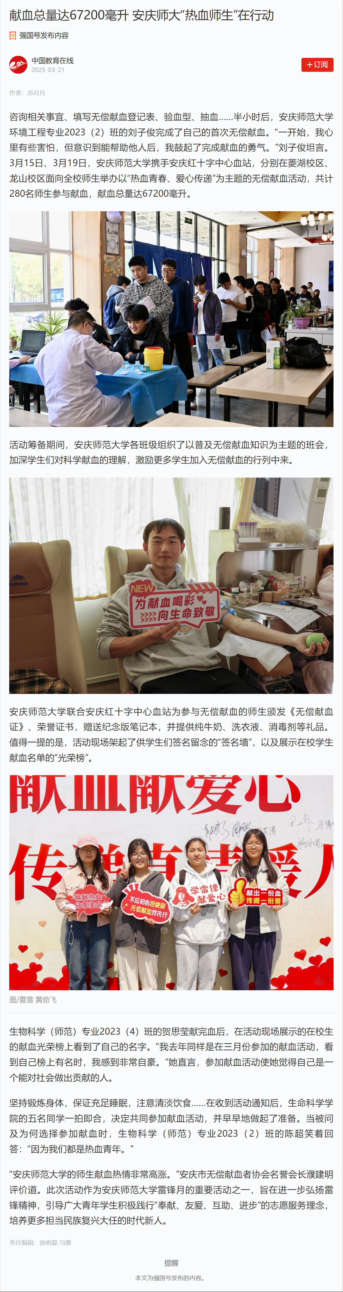 上一篇:中国教育在线:献血总量达67200毫升 安庆师大“热血师生”在行动