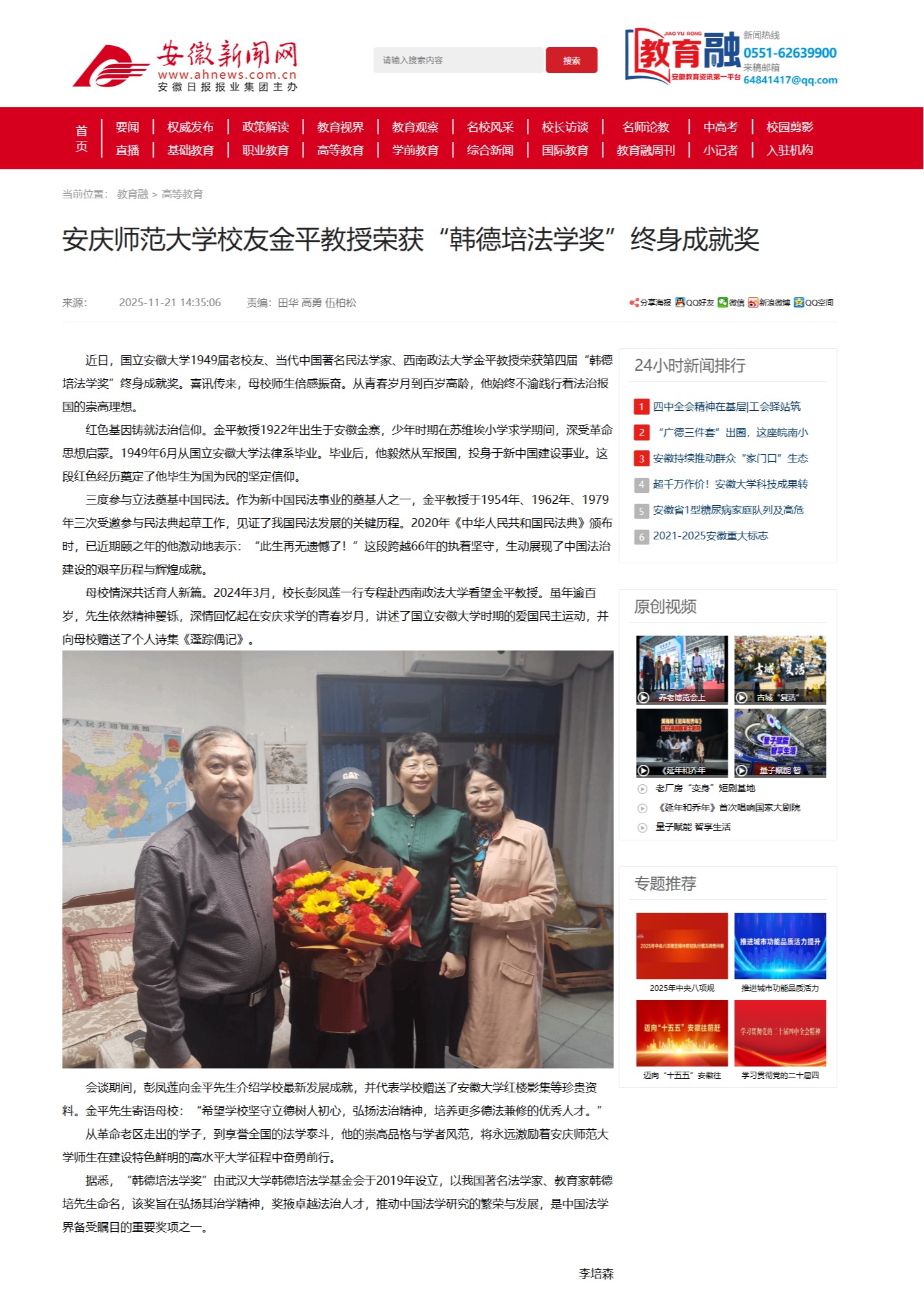 【安徽新闻网】beat365英国官网网站校友金平教授荣获“韩德培法学奖”终身成就奖http://xxt.ahnews.com.cn/news/2025/11/21/c_42557.htm