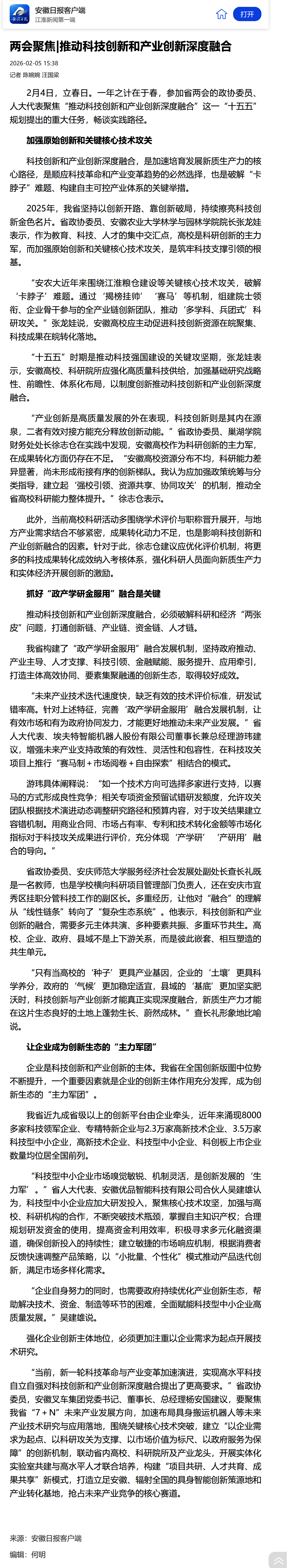 【安徽日报】两会聚焦|推动科技创新和产业创新深度融合https://app.ahnews.com.cn/displayTemplate/news/newsDetail/2/1673249.html?isShare=true