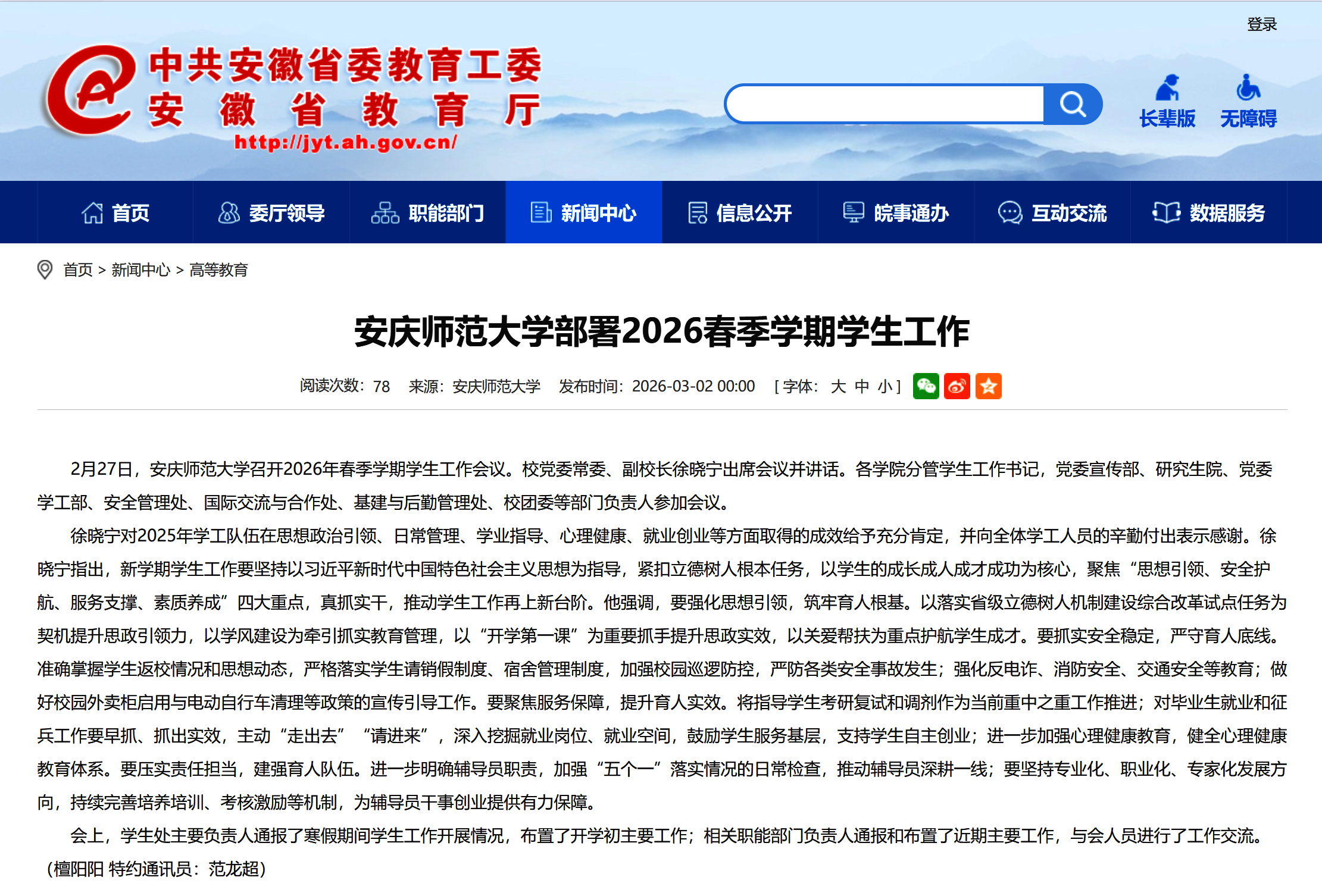【安徽教育网】beat365英国官网网站部署2026春季学期学生工作https://jyt.ah.gov.cn/xwzx/gdjy/40782658.html