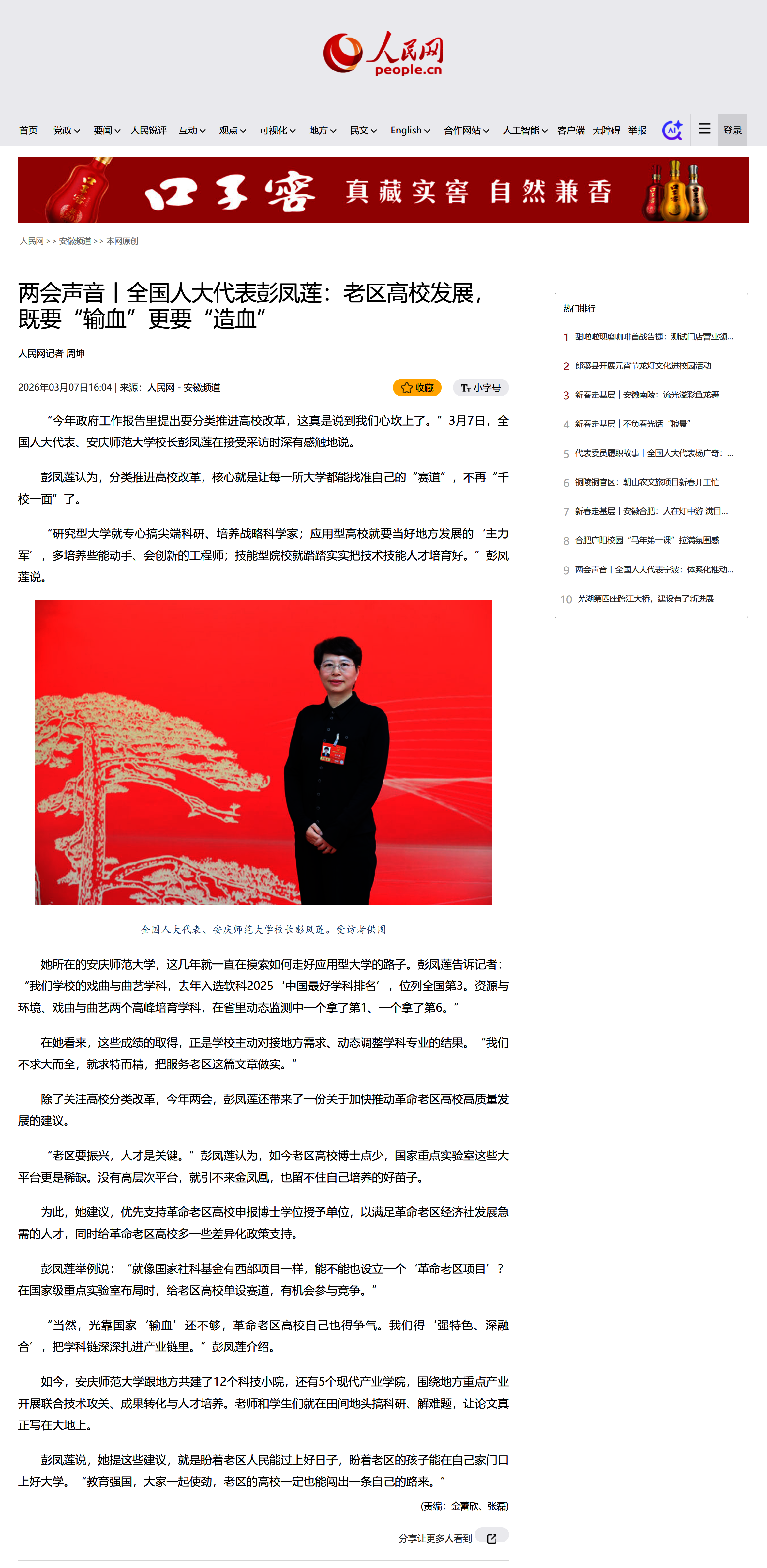 【人民网】两会声音丨全国人大代表彭凤莲:老区高校发展,既要“输血”更要“造血”http://ah.people.com.cn/n2/2026/0307/c227131-41517700.html