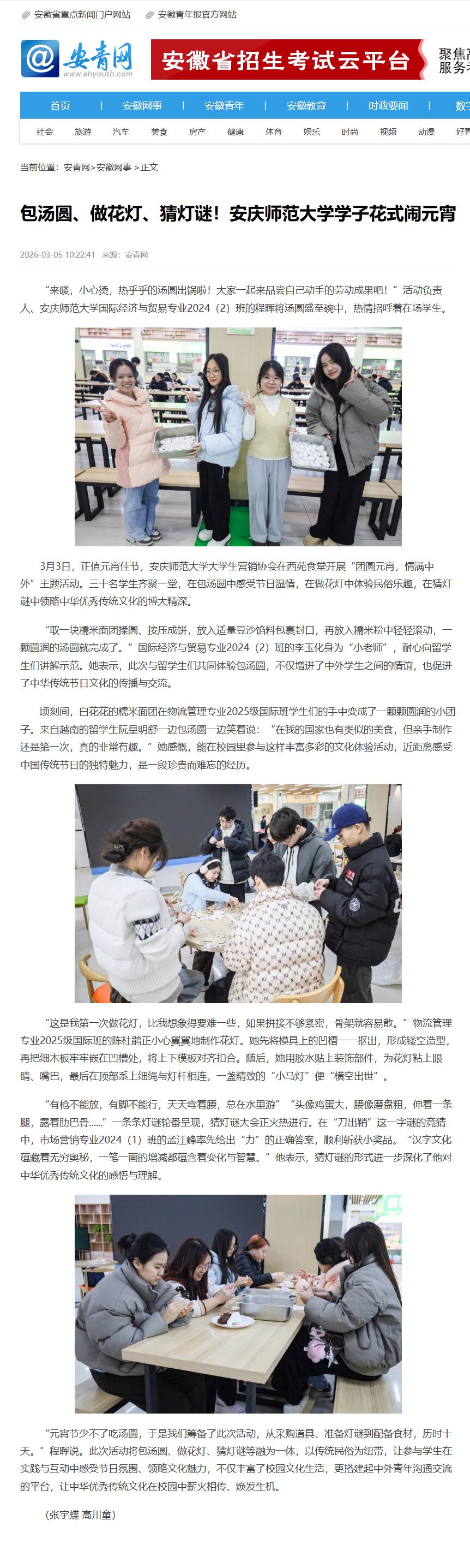 来源:【安青网】包汤圆、做花灯、猜灯谜!beat365英国官网网站学子花式闹元宵https://www.ahyouth.com/news/20260305/1778214.shtml