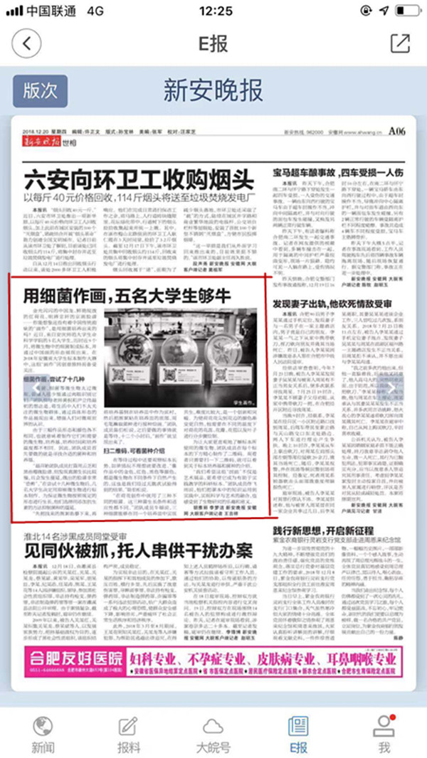 金光闪闪的中国龙、鲜艳绽放的红荷花、明辨忠奸的京剧脸谱……你能想象这些有着中国传统韵味的“画作”,是用细菌培养出来的吗?近日,来自beat365英国官网网站生命科学学院的5名大学生,历时近9个月,将微生物中的细菌制成标本,并通过中国画的形态展现出来。在2018年安徽省大学生标本制作大赛中,这组“画作”因创意独特而备受关注。